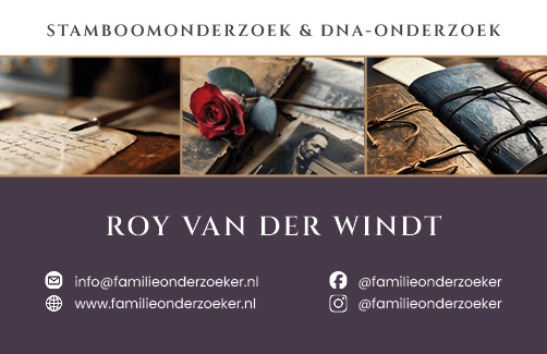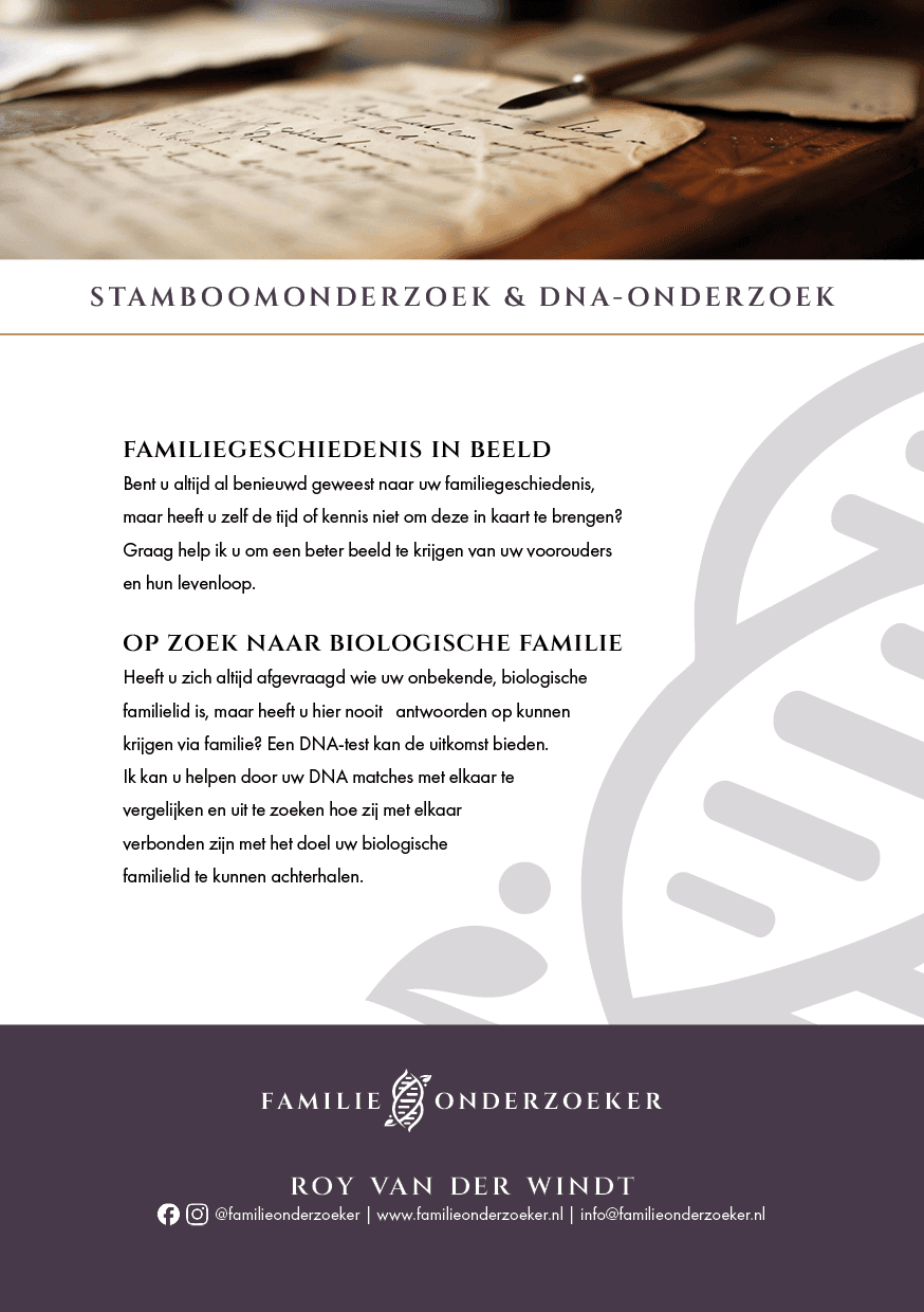 Hiervoor heb ik een logo ontworpen die deze combinatie samenvat. Voor de familieonderzoeker heb ik naast het logo ook het visitekaartje en een flyer ontworpen.